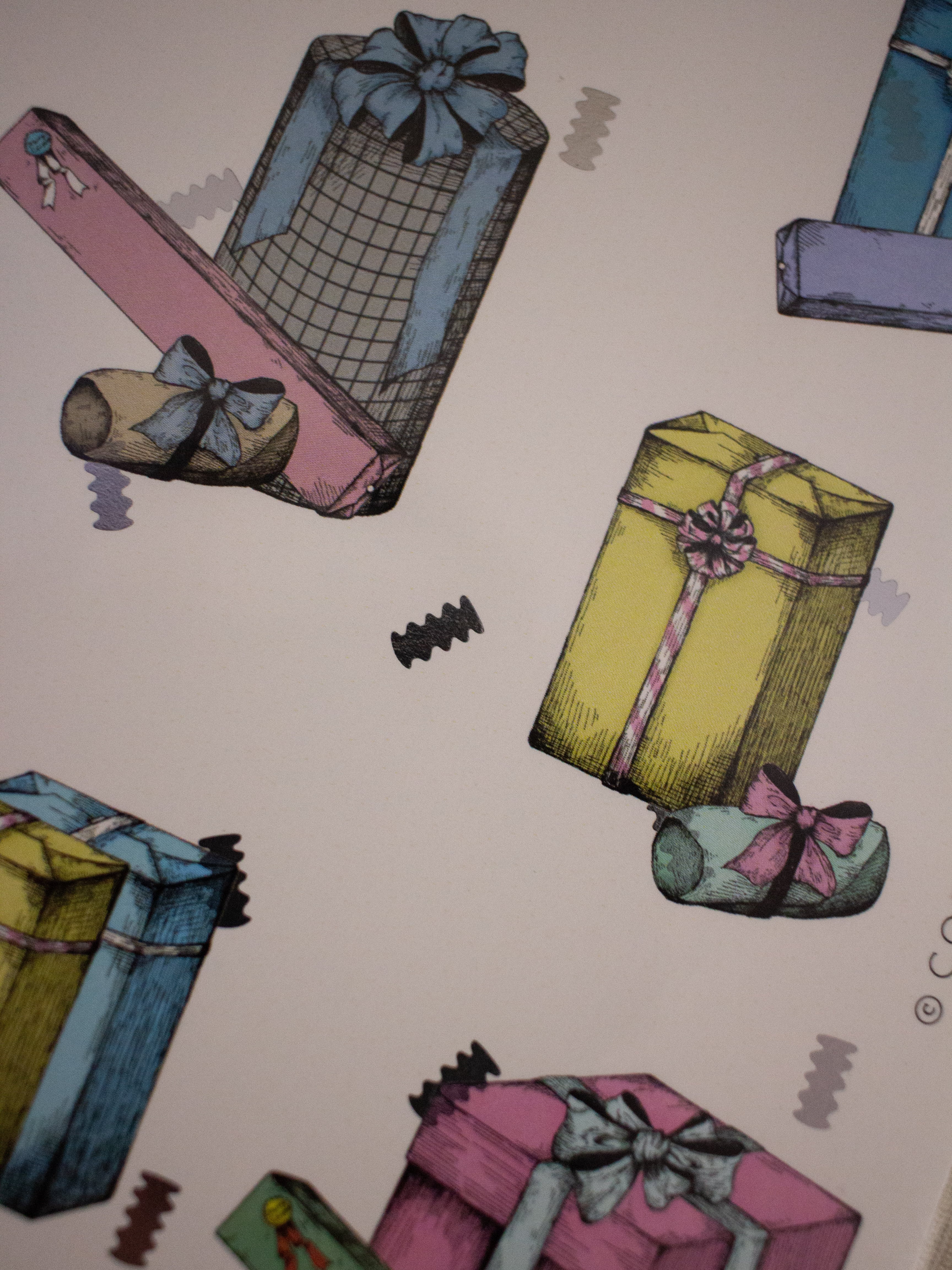 たくさんの形のプレゼントボックスには何が入っているのか、楽しく考えてしまうペーパー。