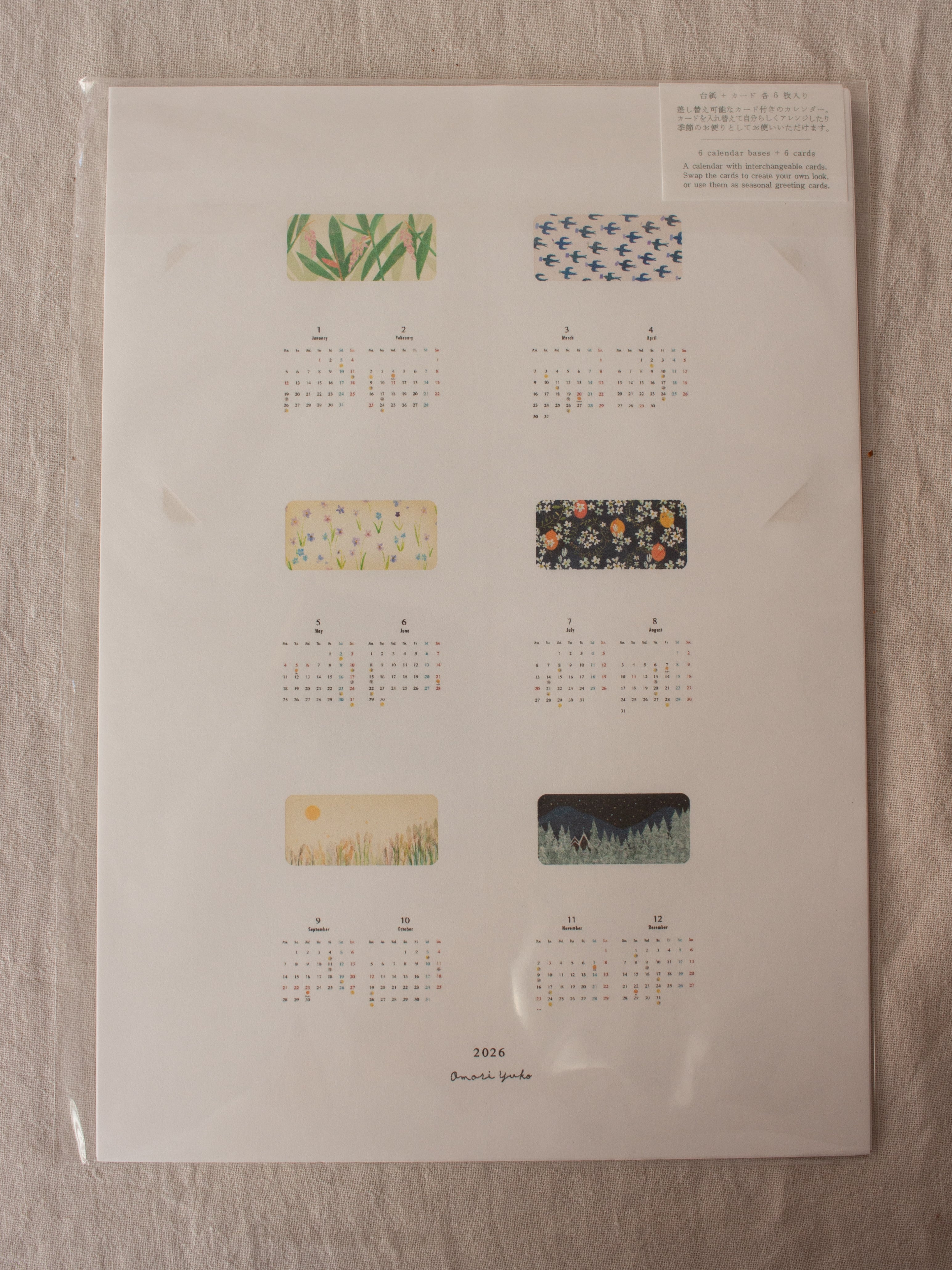 大森木綿子さんのオリジナルデザインのカードが6枚と2ヶ月ごとのカレンダー用紙がセットになった特別なカレンダー。