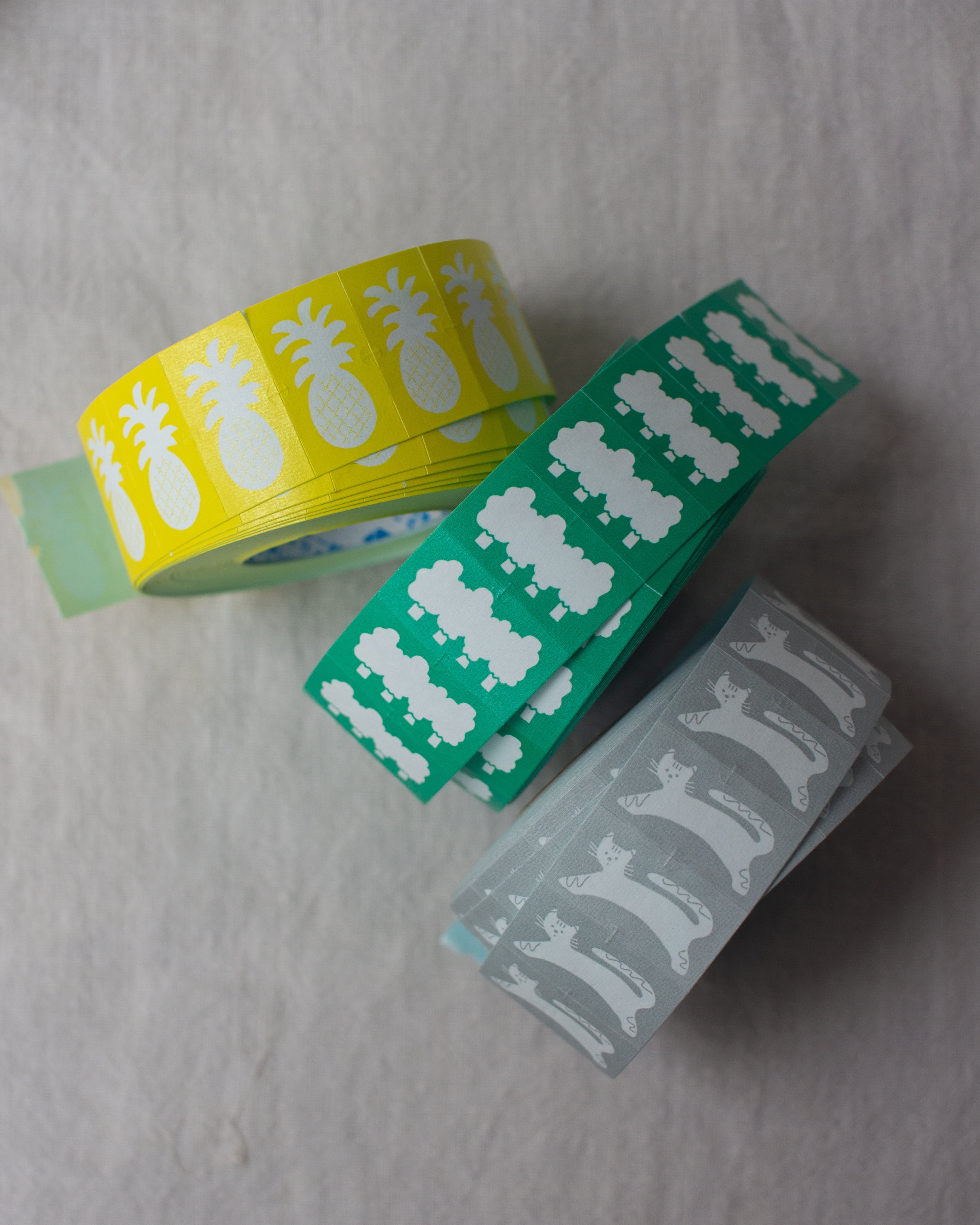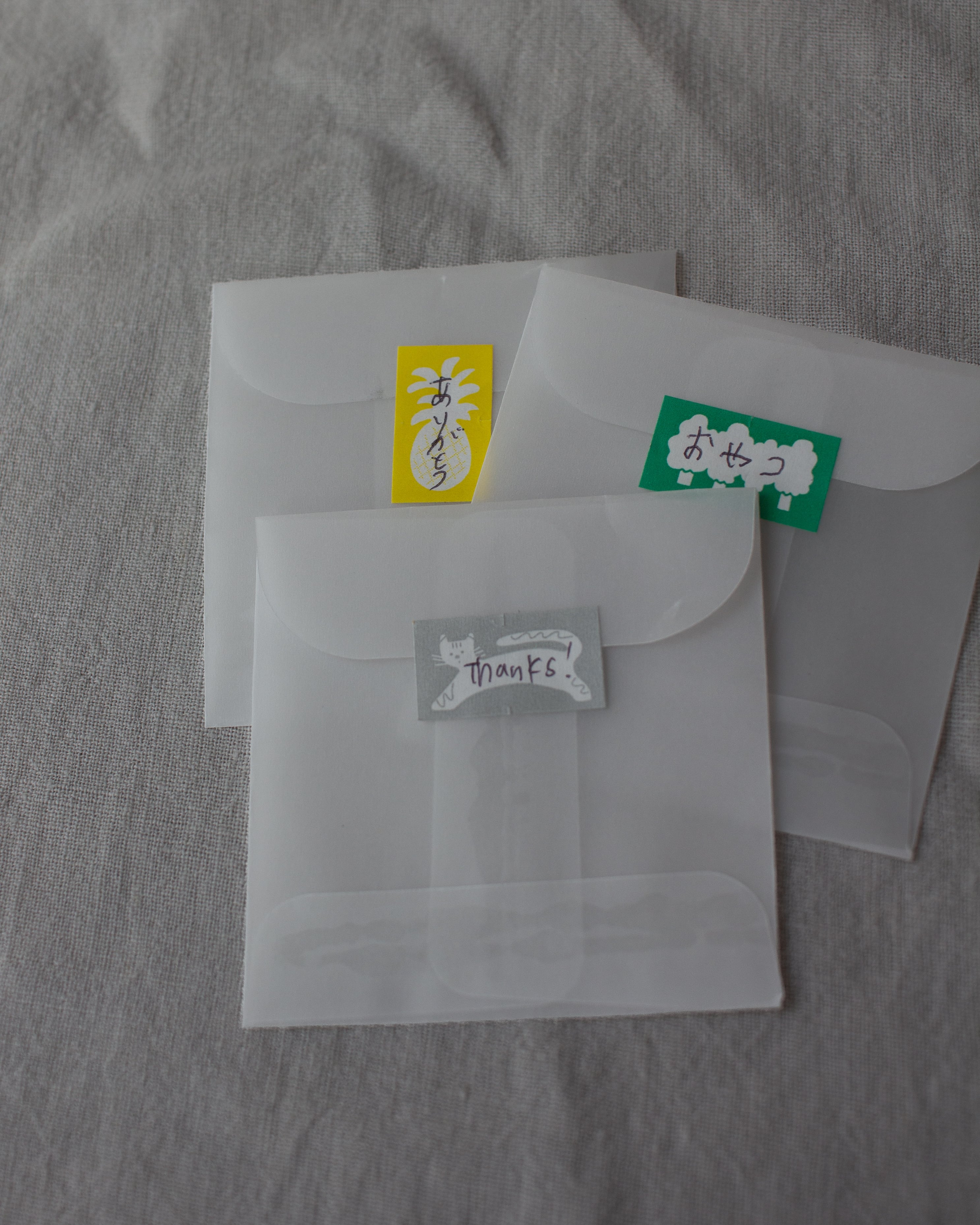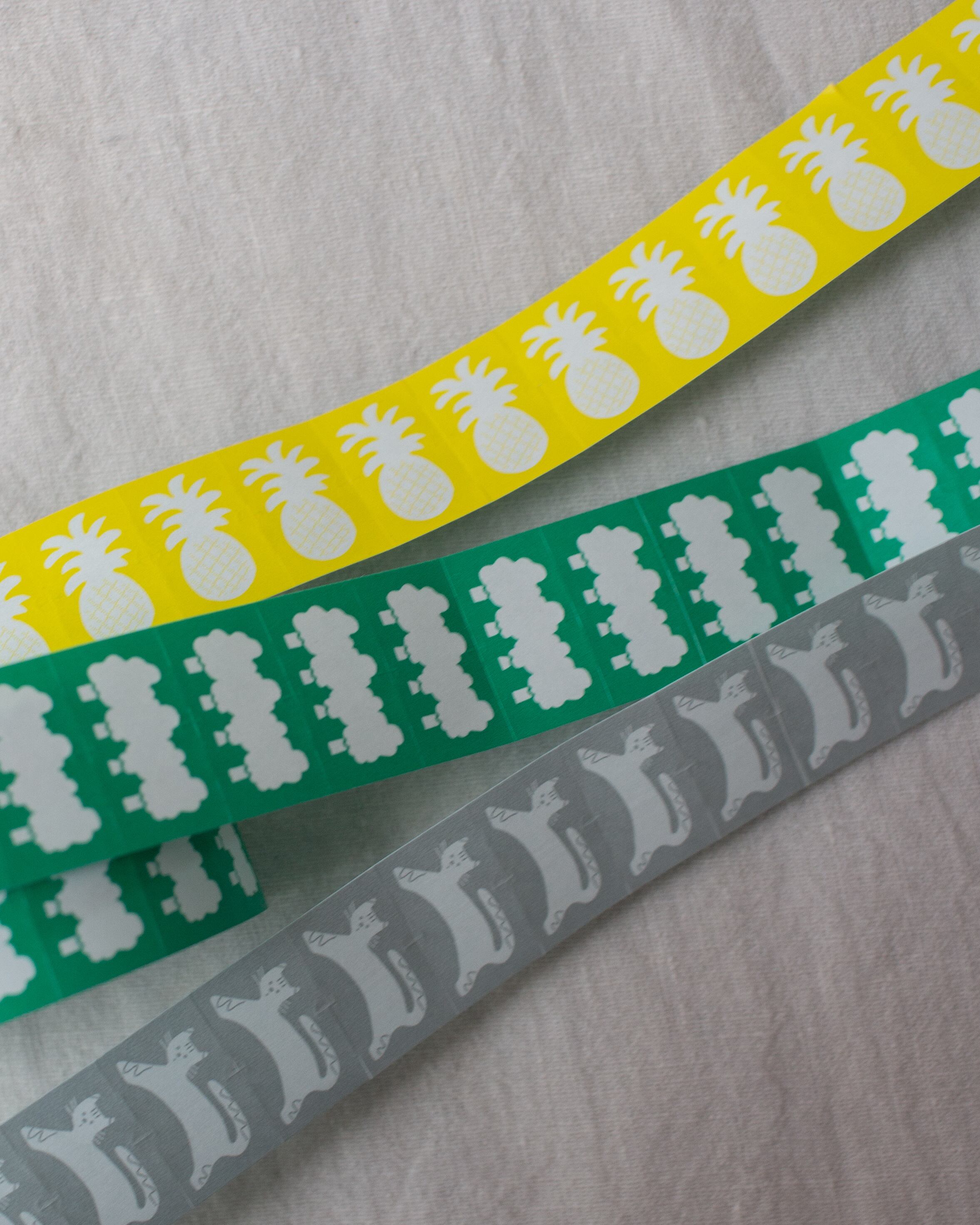 甘酸っぱい南国の果物といえばパイナップル、沖縄の北部の名所、フクギナミキ、西表島のシンボル、イリオモテヤマネコ。それぞれ白部分には文字を書いたりスタンプをおしたり、楽しいんで頂けるイラストに。