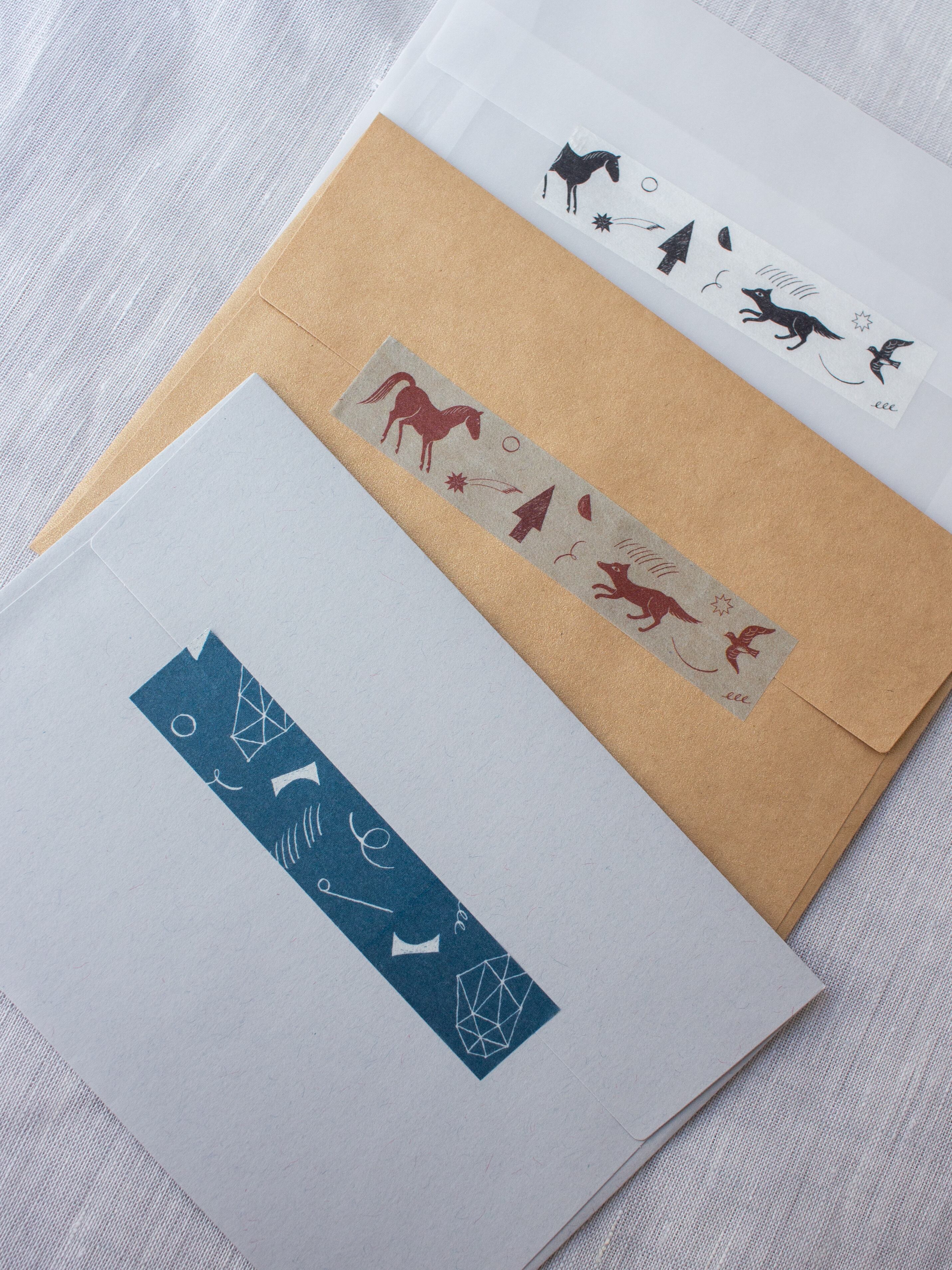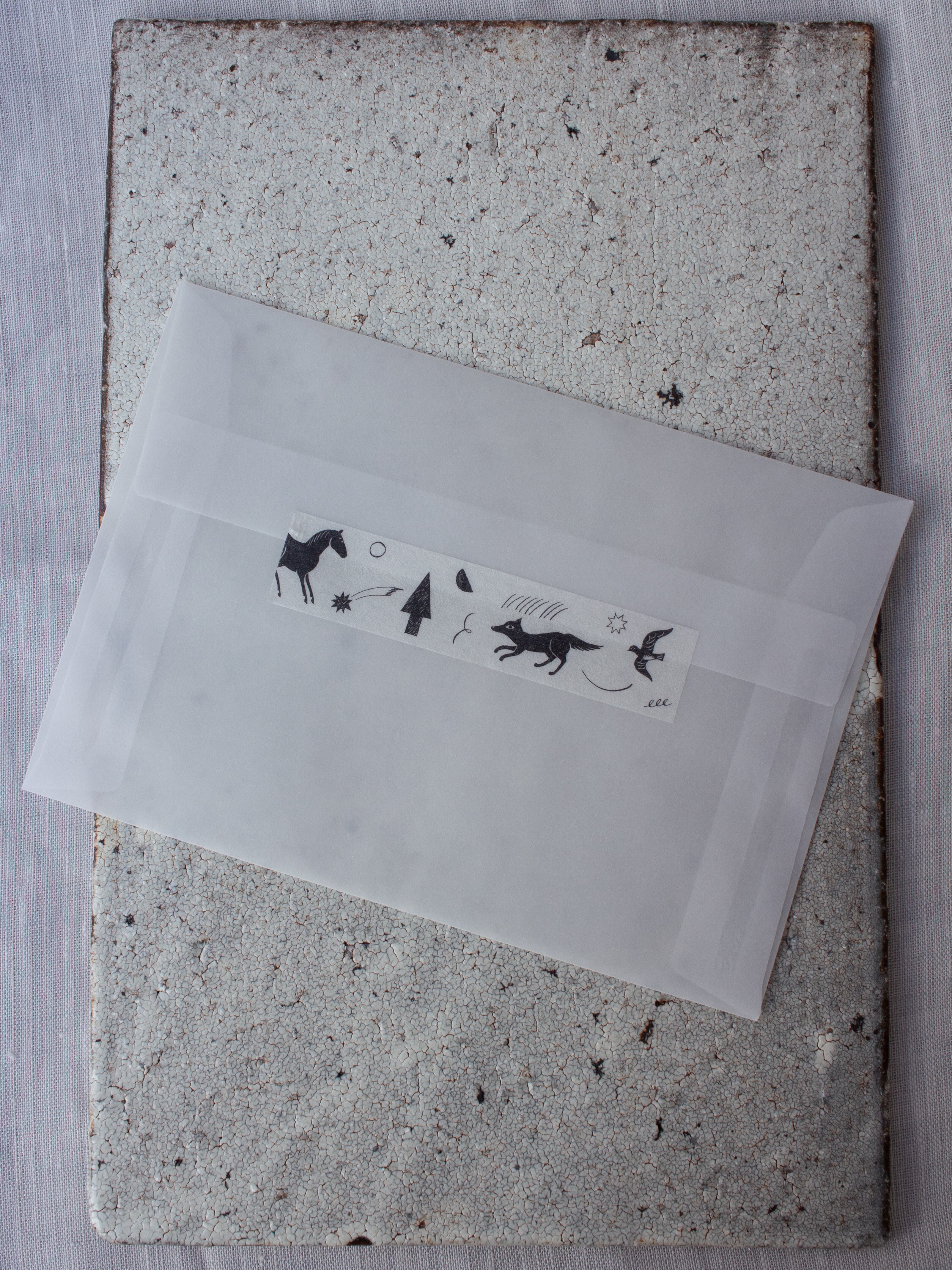 夜の闇をかけるような馬や星とりたち、幾何学模様。シンプルな線画でありながら唯一の世界を描く西淑さんらしい美しいテープです。