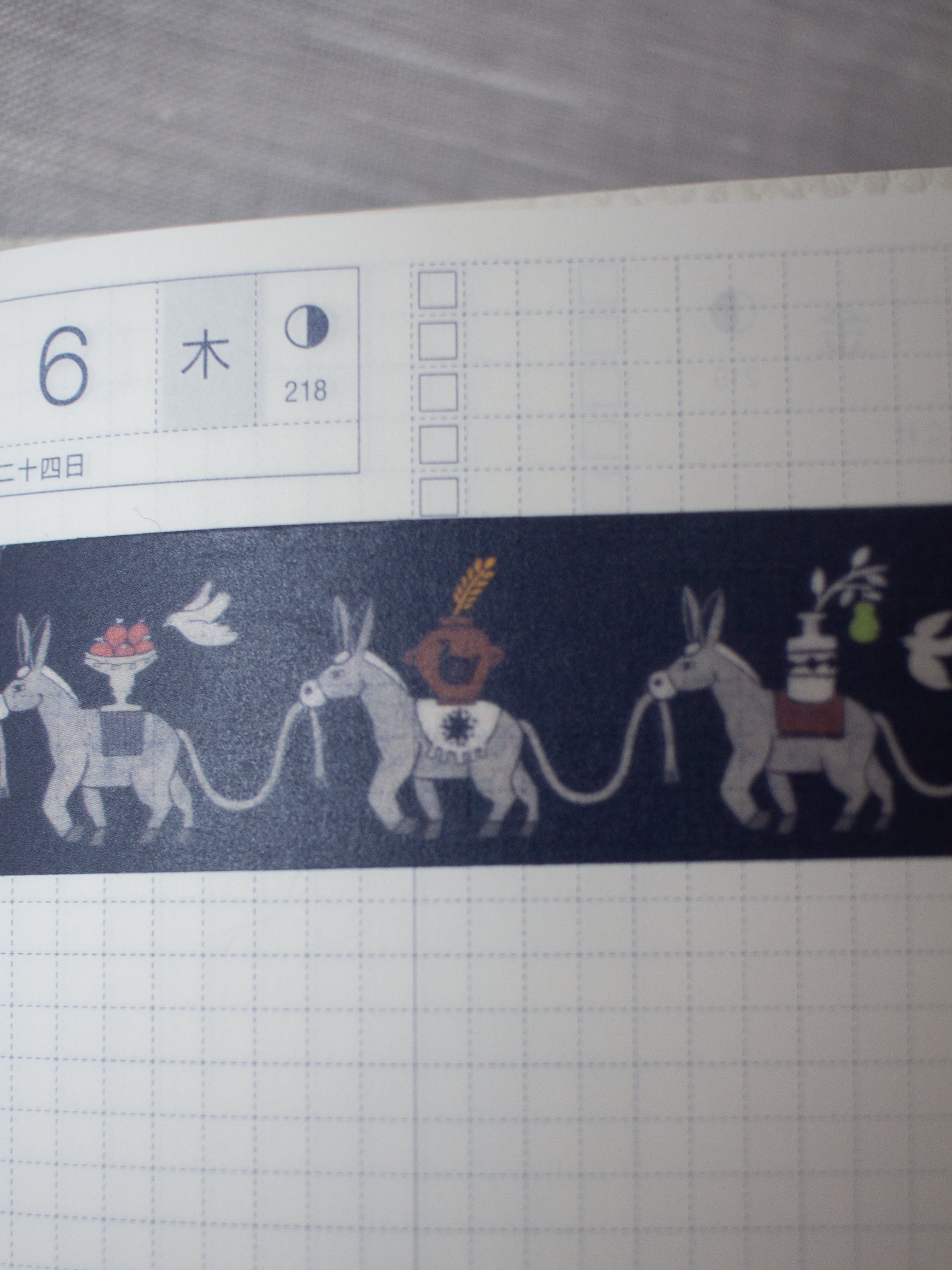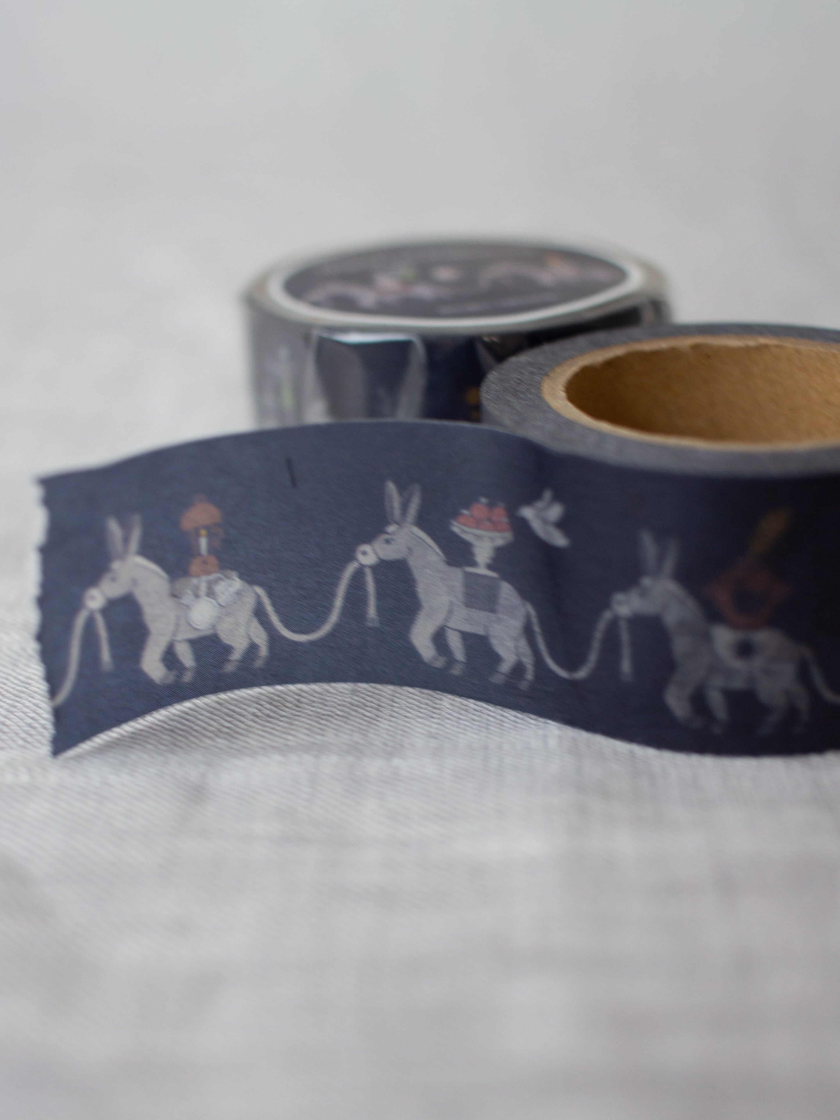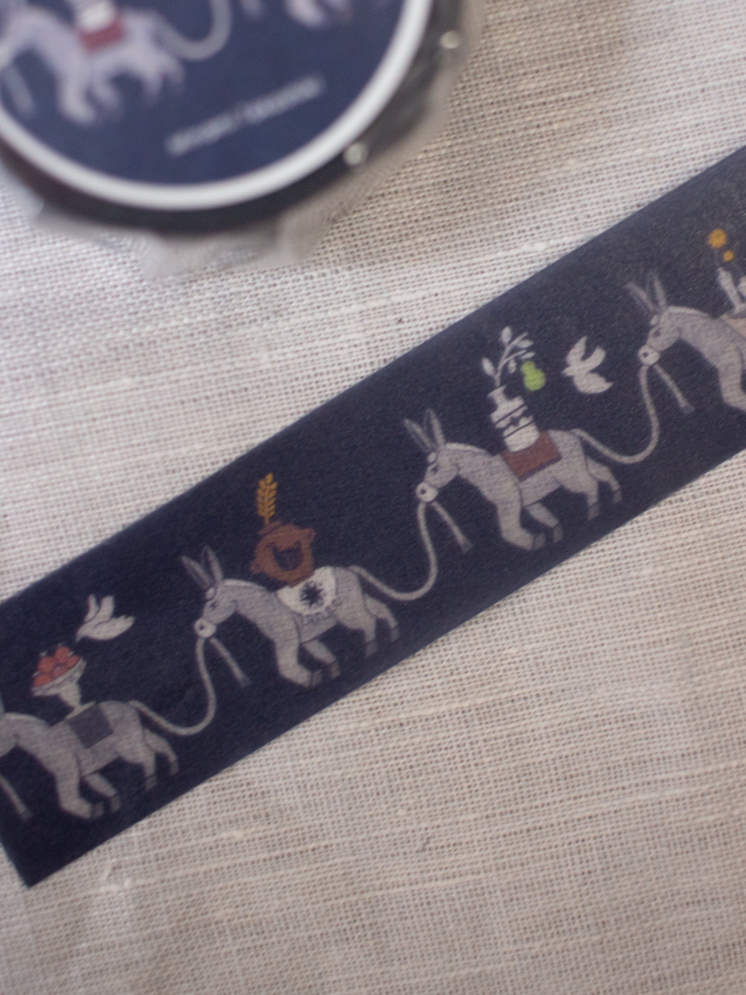 真面目だけどちょっと抜けている、そんな愛らしさをイメージして、それぞれのロバが小さな幸せを運んで行進する様子をマスキングテープにしました。