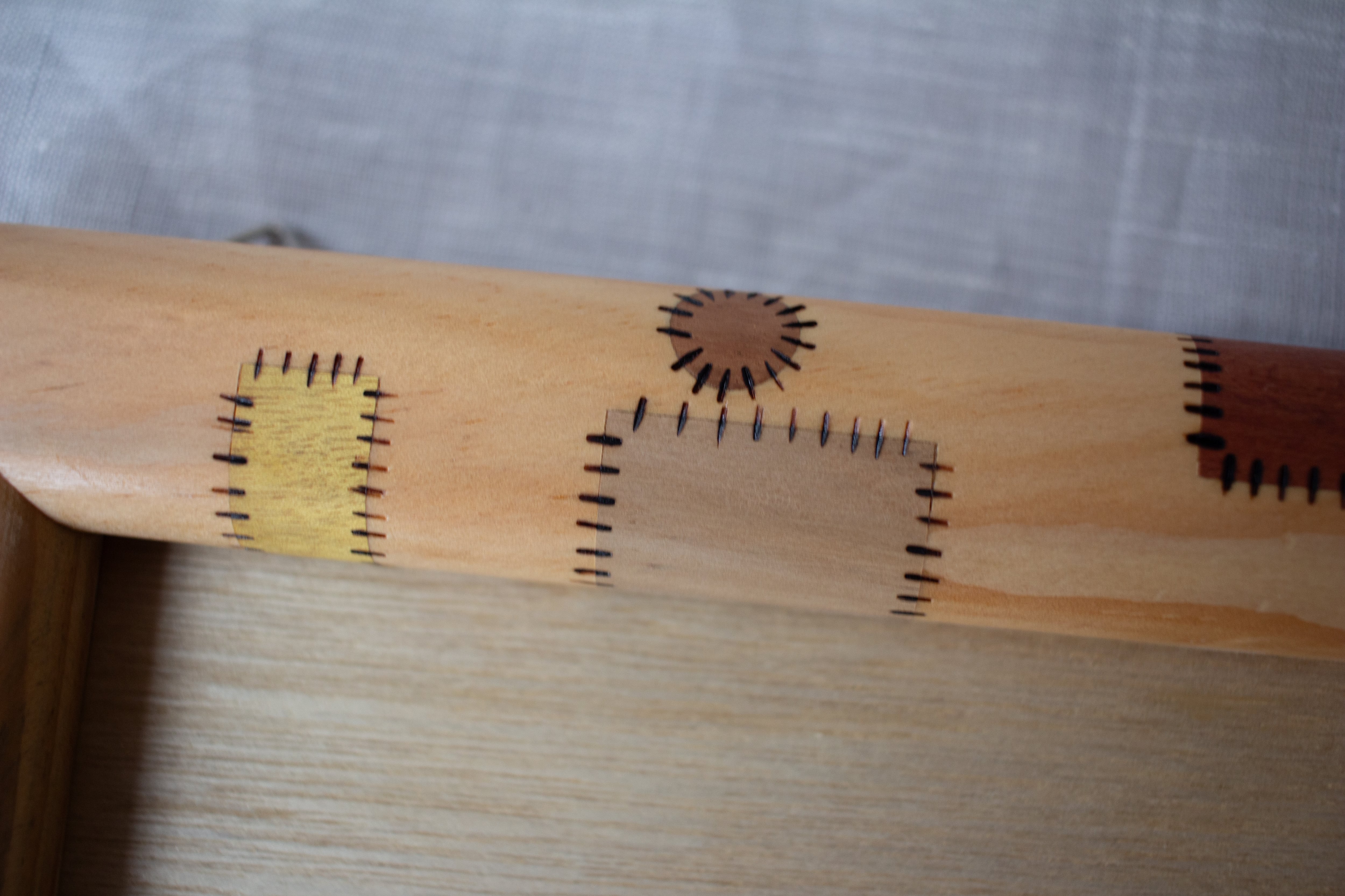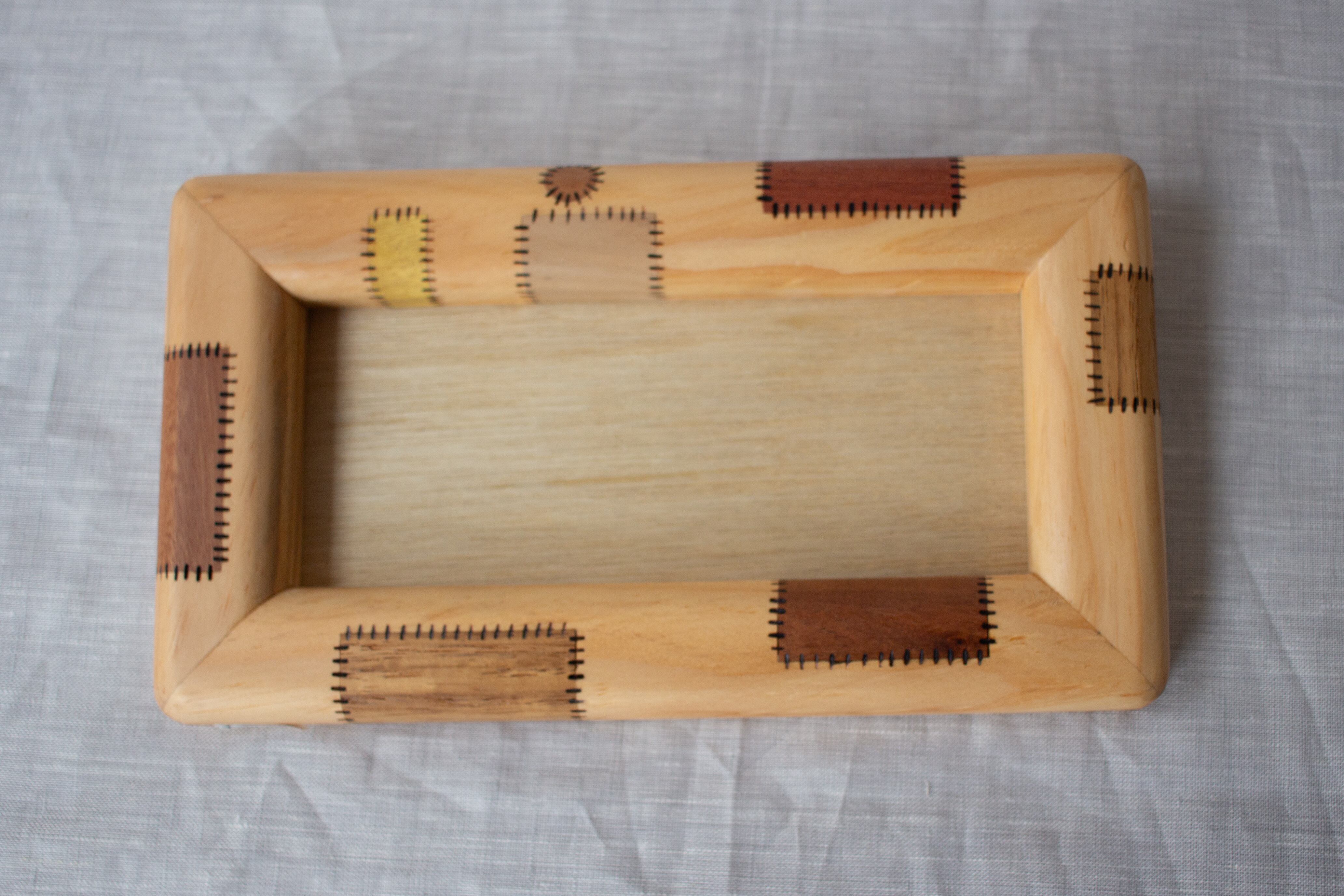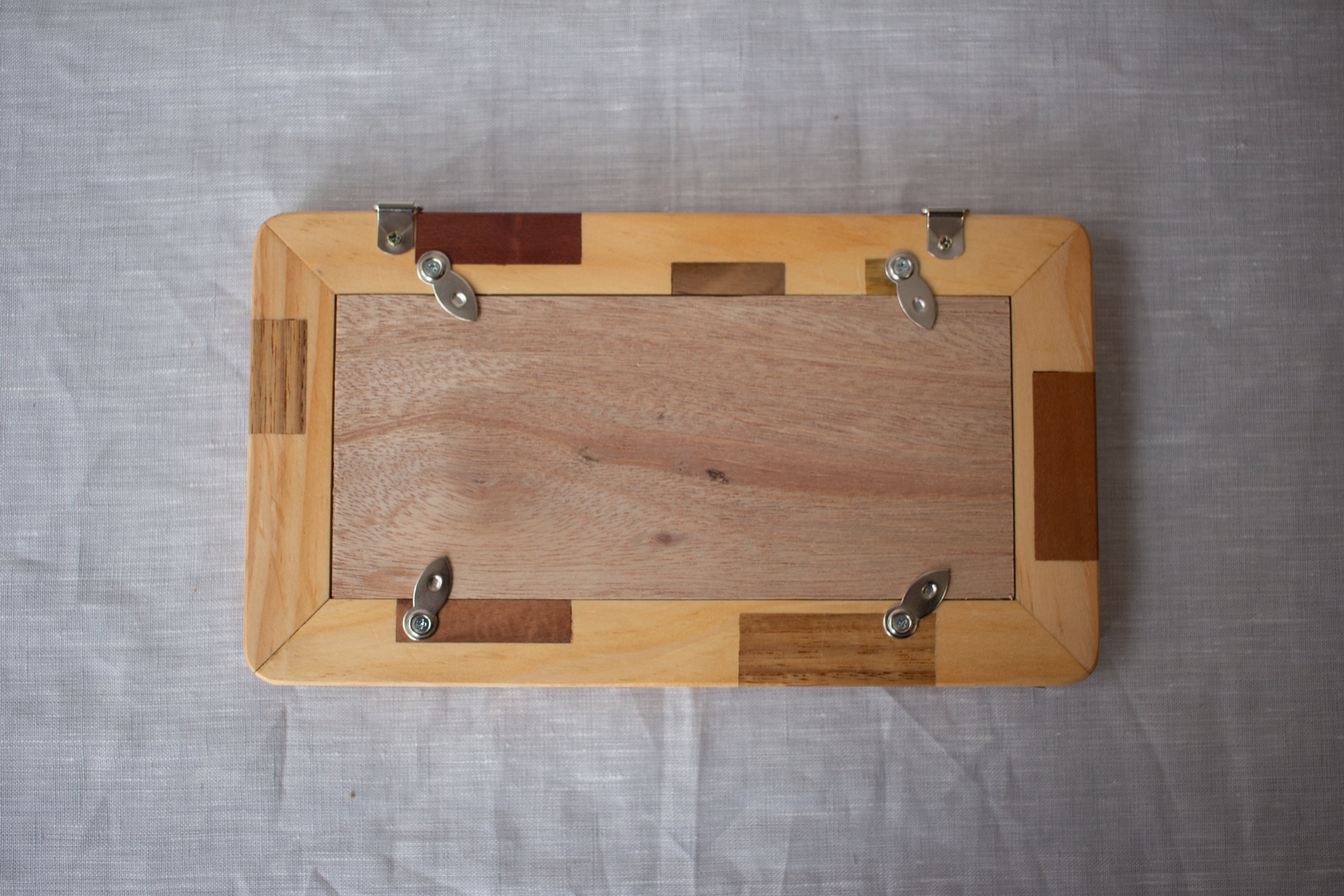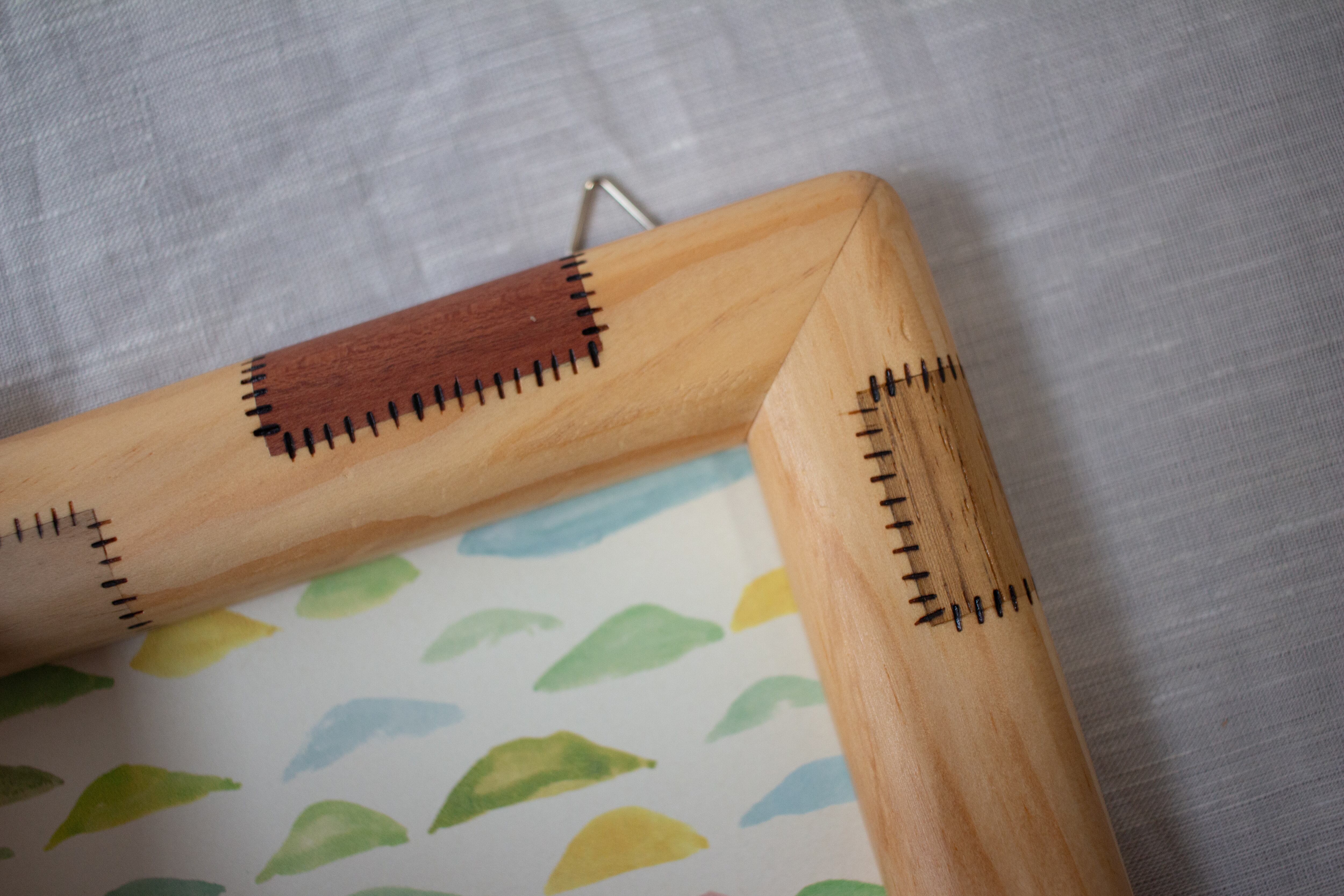 沖縄の四つの木工房のチーム「家具家」さんに作っていただいた額の展示販売会『額の市』よりテツモクさんのツギハギのようにたくさんの木材を入れ込んだ個性的な額です。