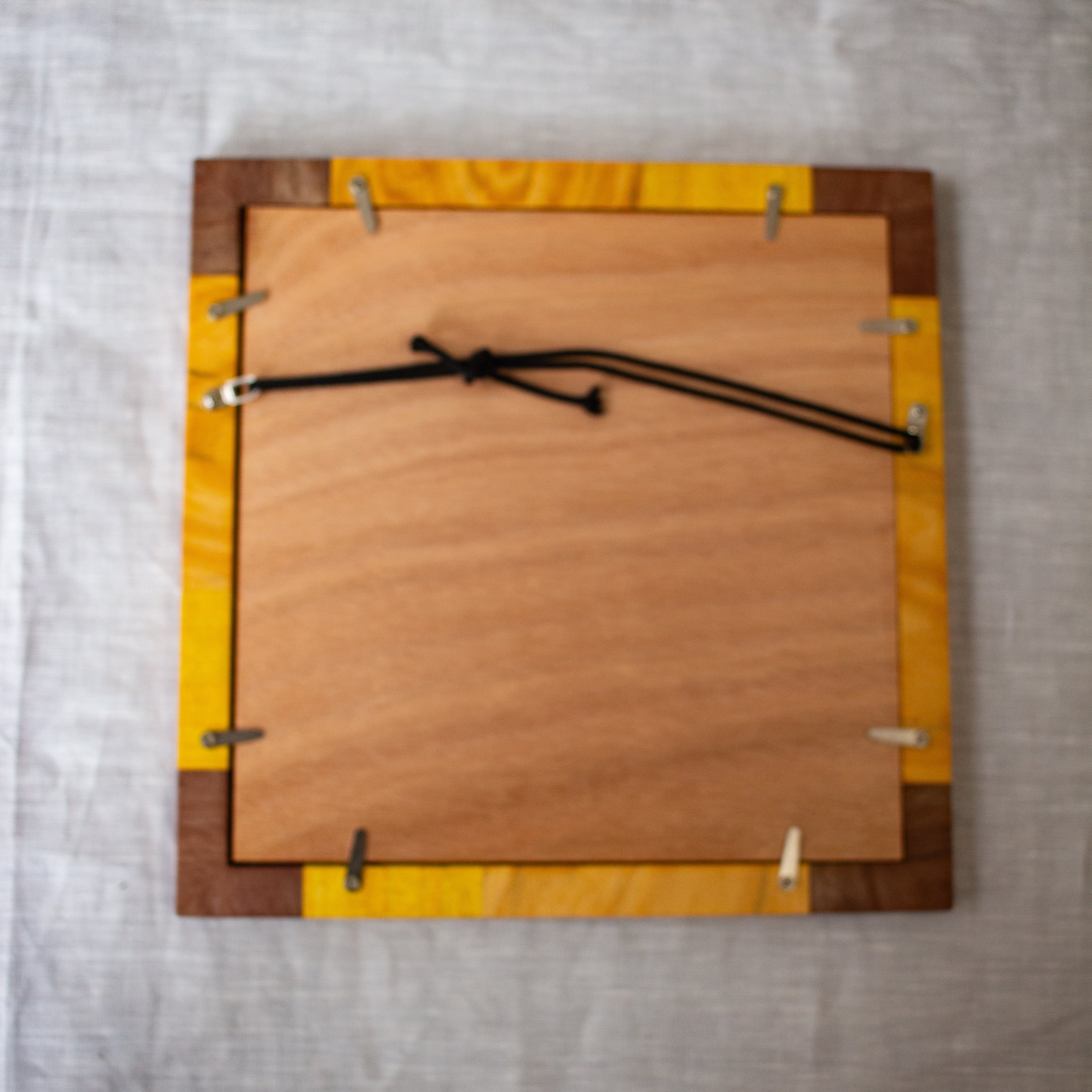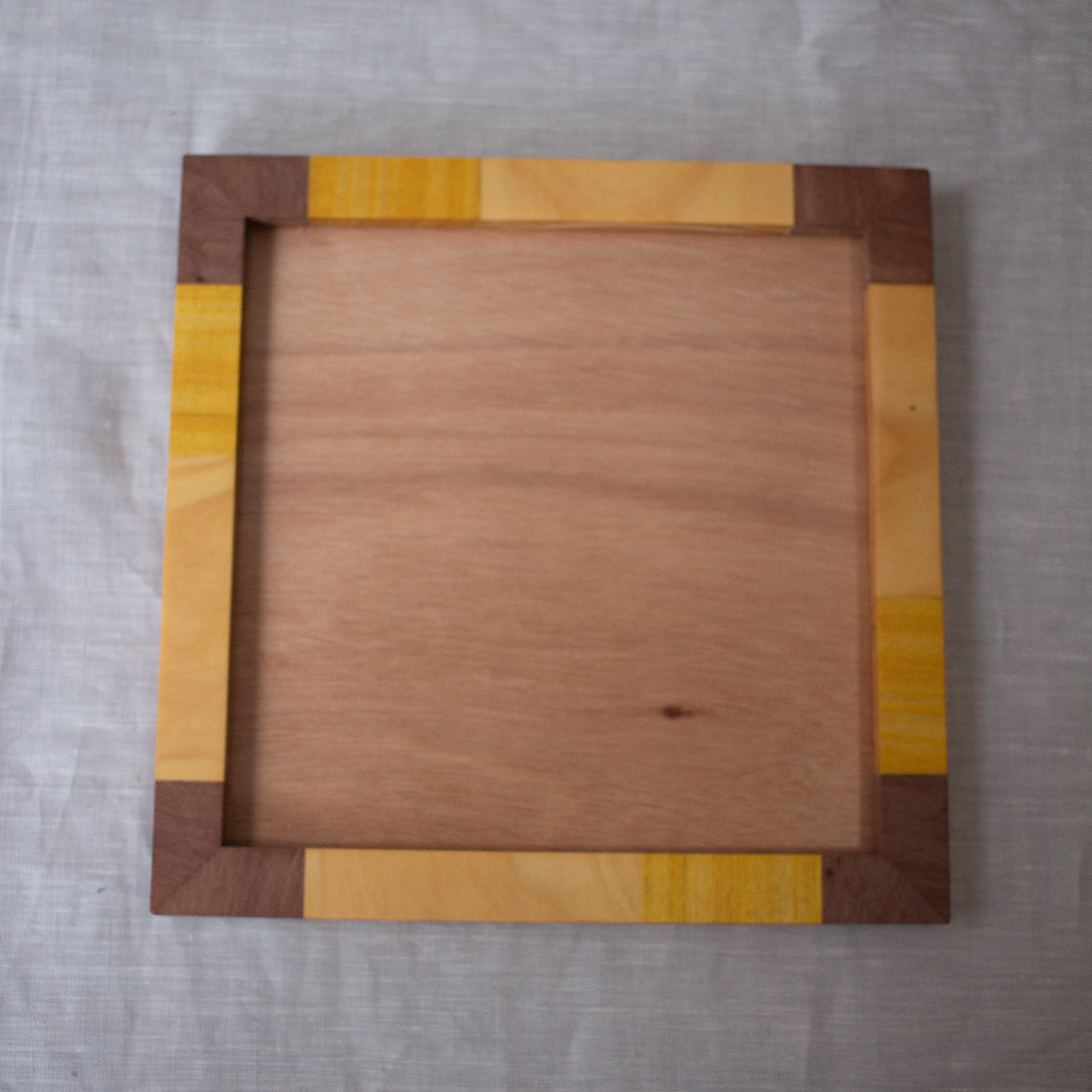 沖縄の四つの木工房のチーム「家具家」さんに作っていただいた額の展示販売会『額の市』より新福木工さんの4つの木材を使った珍しい正方形の額。