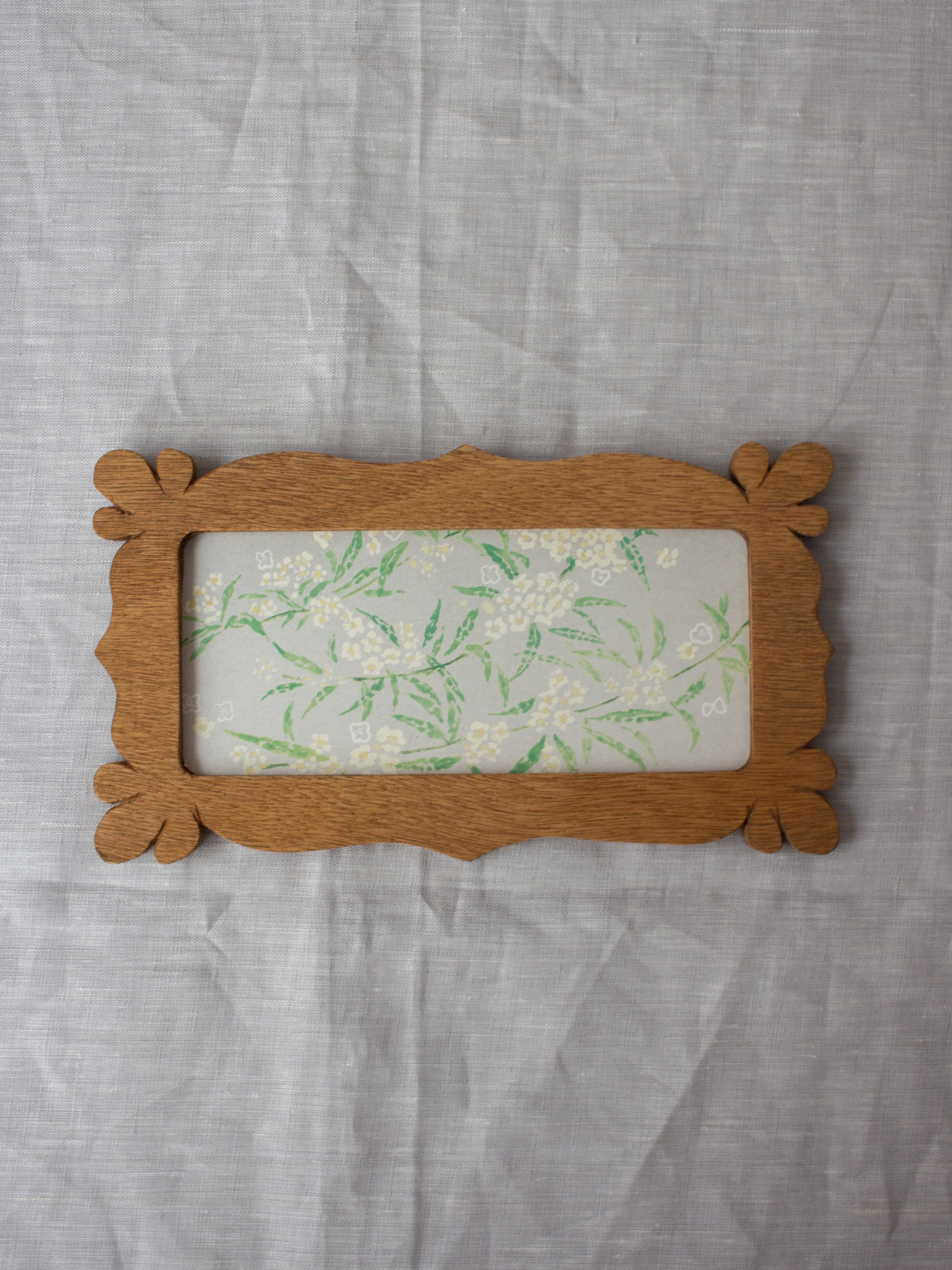 沖縄の四つの木工房のチーム「家具家」さんに作っていただいた額の展示販売会『額の市』より木工ヤマウチさんの合板で作った横長額。合板のビスケットの様な層と花びらの様な形が紙好きのみなさんにも愛されそうです。