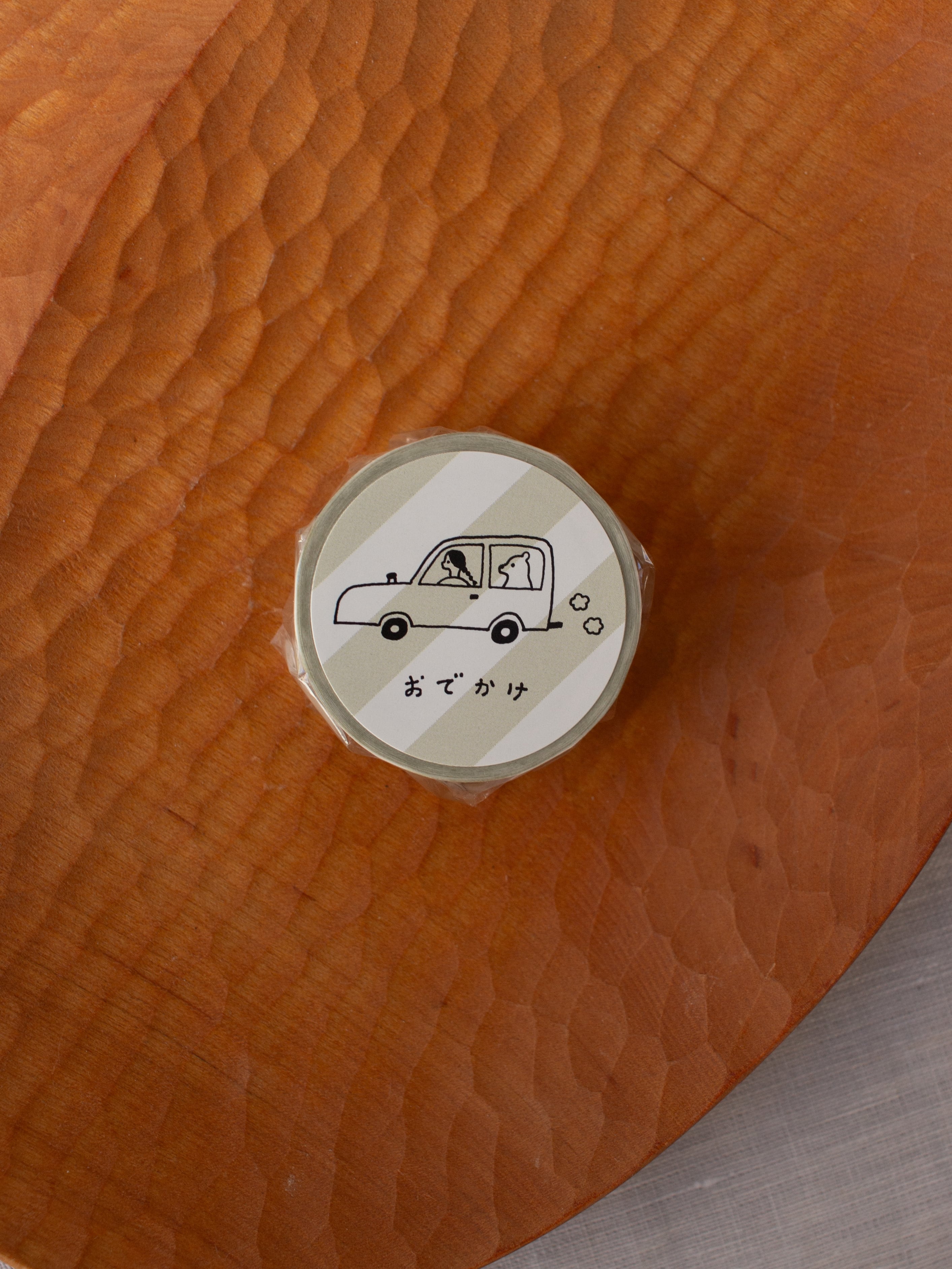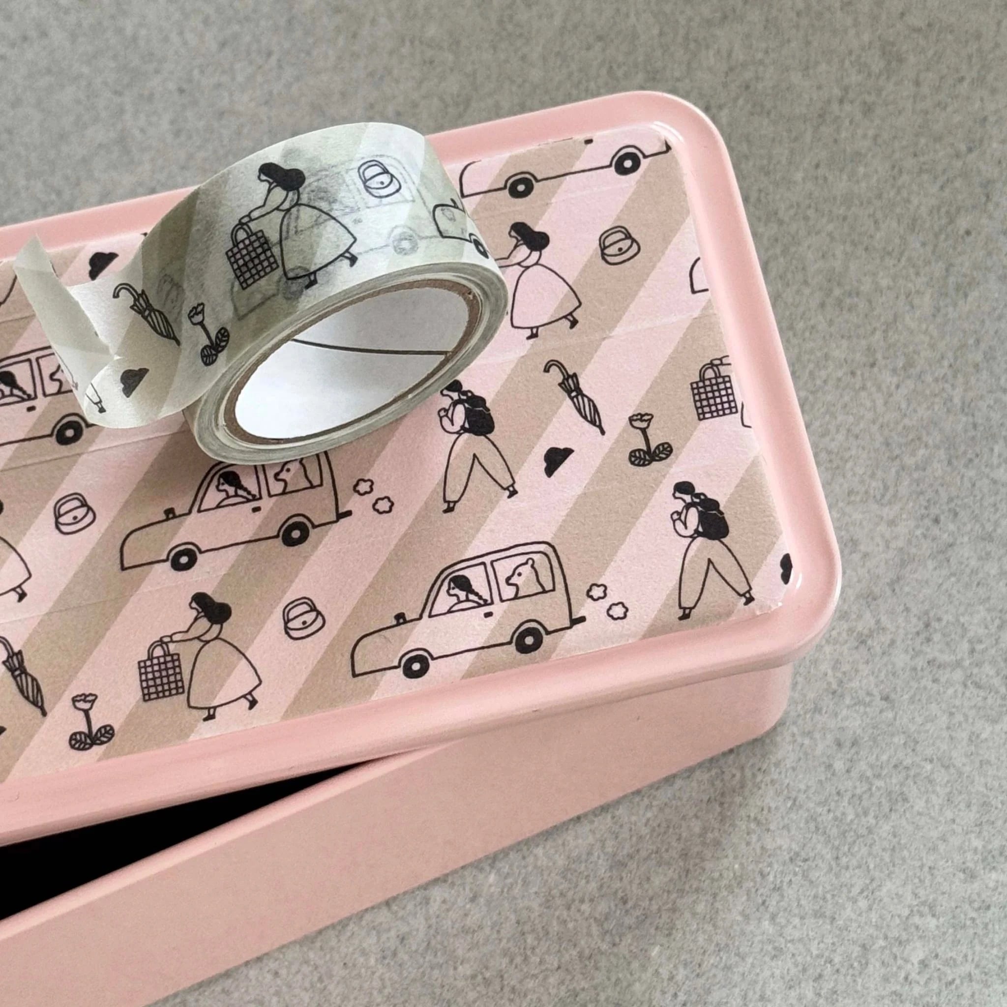 水縞さんの人気商品「自在ハンコ ポケット おでかけ」のパーツを押して作ったマスキングテープです。ドライブしたりお散歩したり、楽しいお出かけのシーンが描かれています。