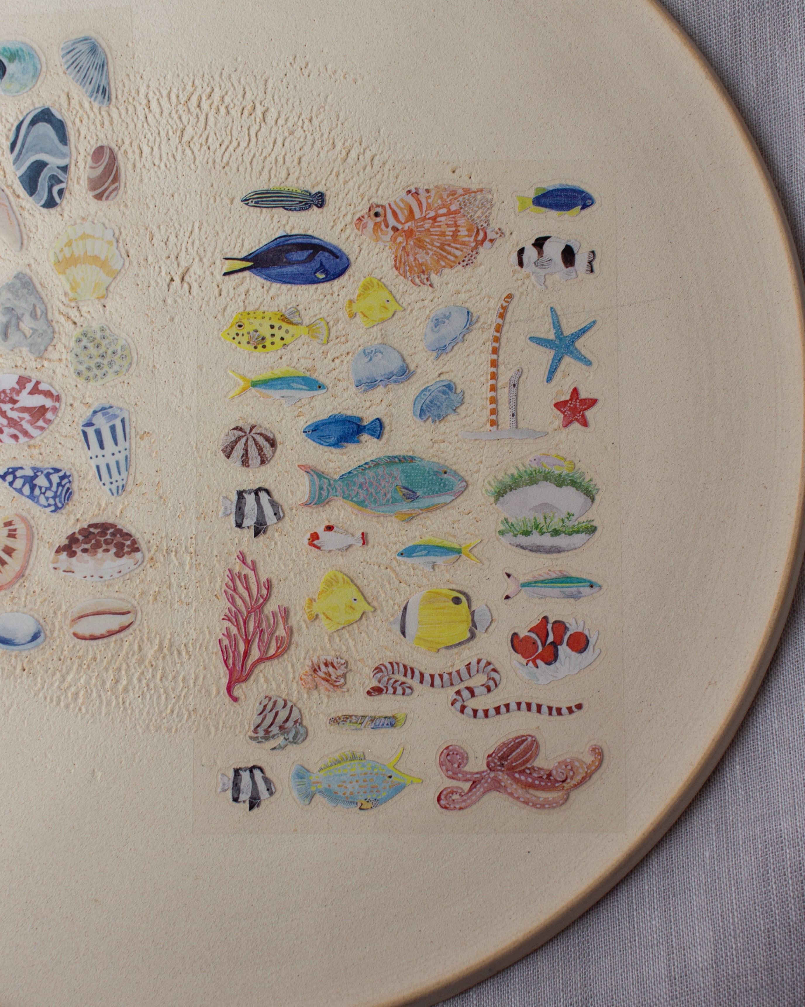 海辺の珊瑚や貝、魚をそのまま切り取るように仕立てた透明シールです。