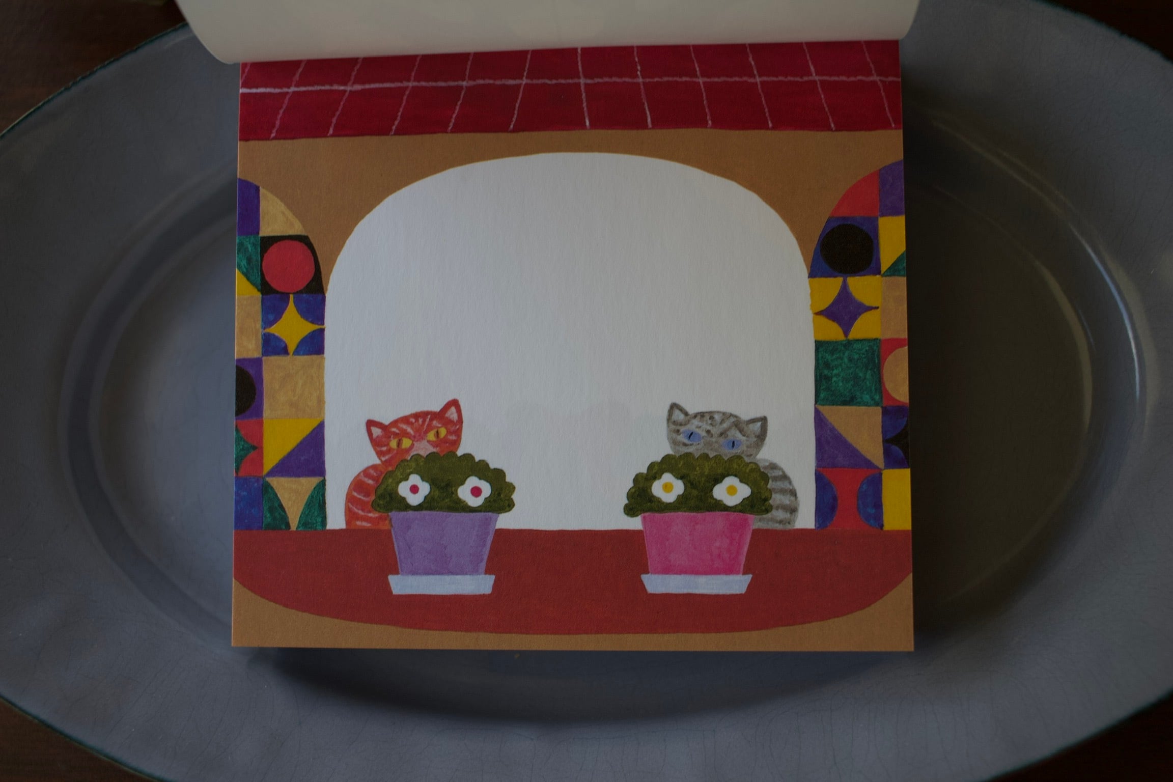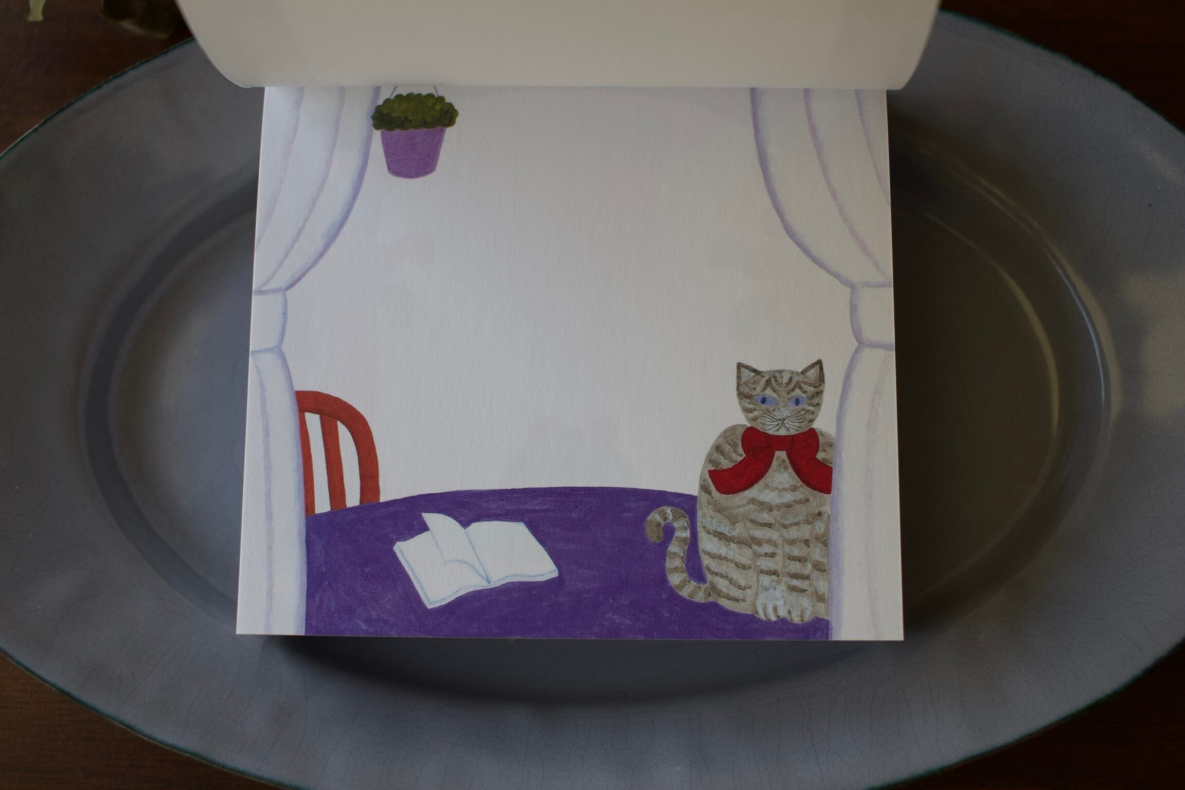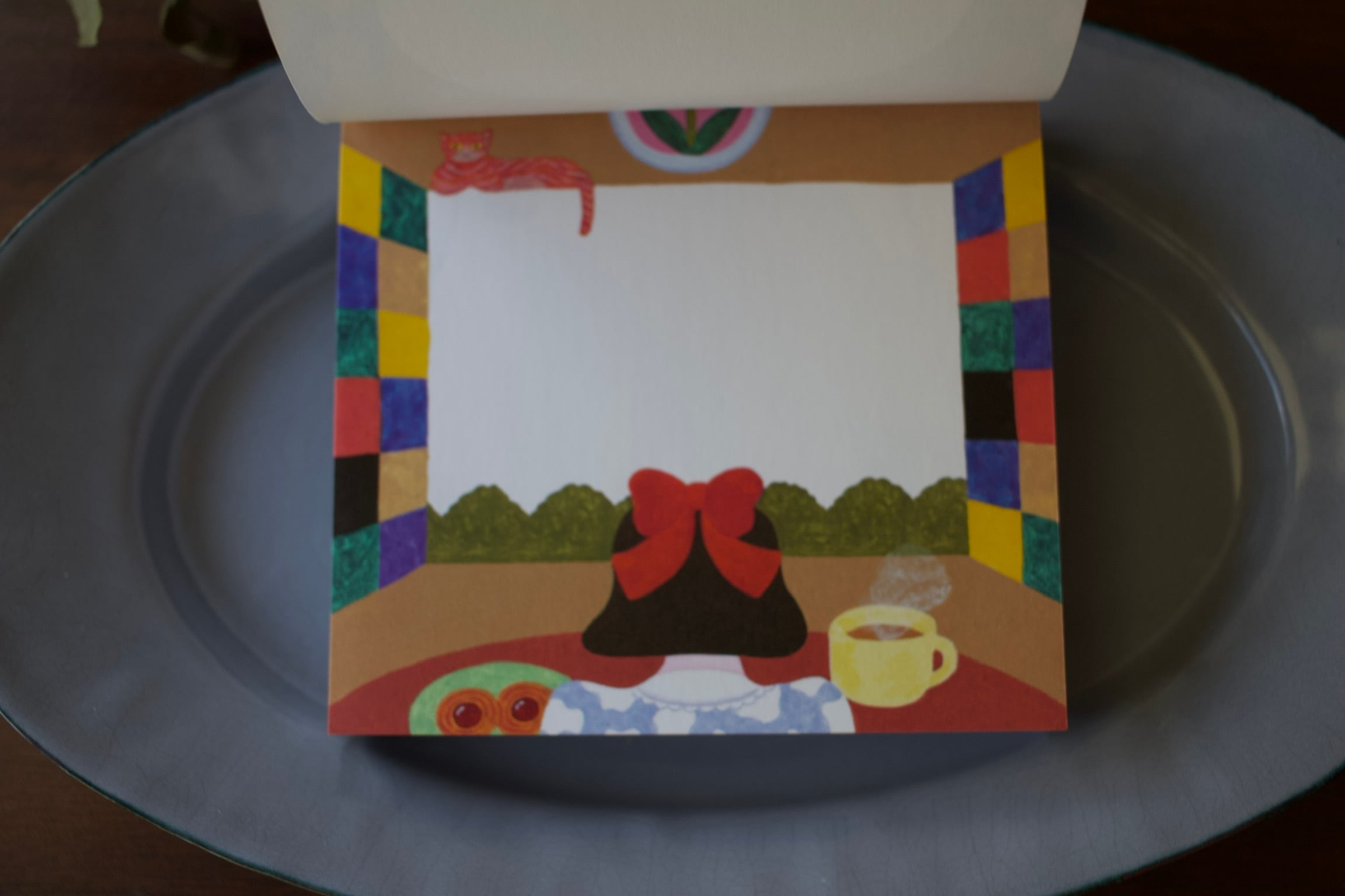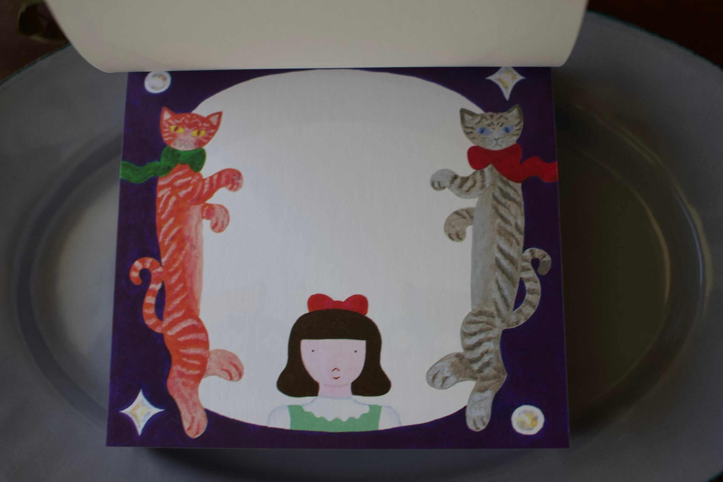 シマシマの猫と大きなリボンの女の子が描かれた、ひろせべにさんののブロックメモ。