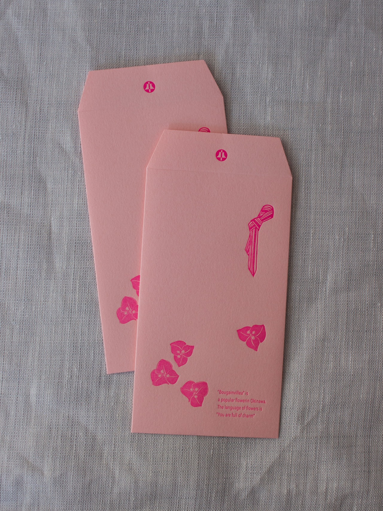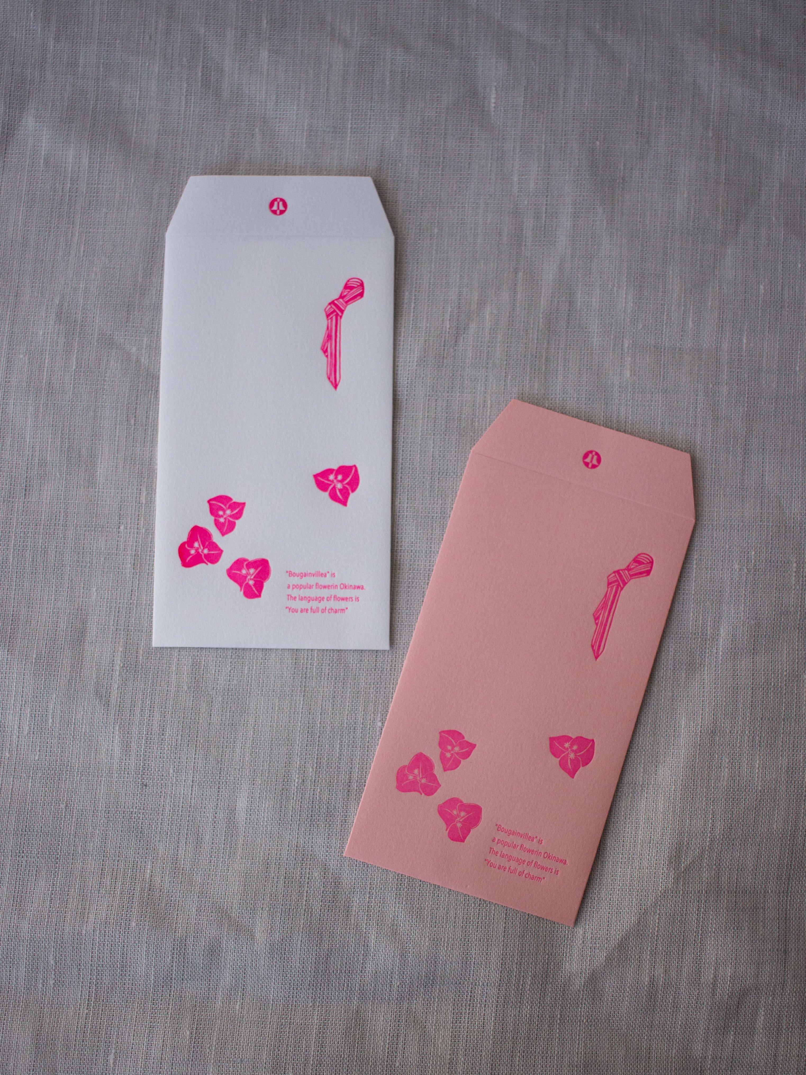 新しく活版印刷のポチ袋は熨斗の代わりに沖縄のお守り「サングヮー」をあしらったユーモアで少し懐かしいシリーズ。