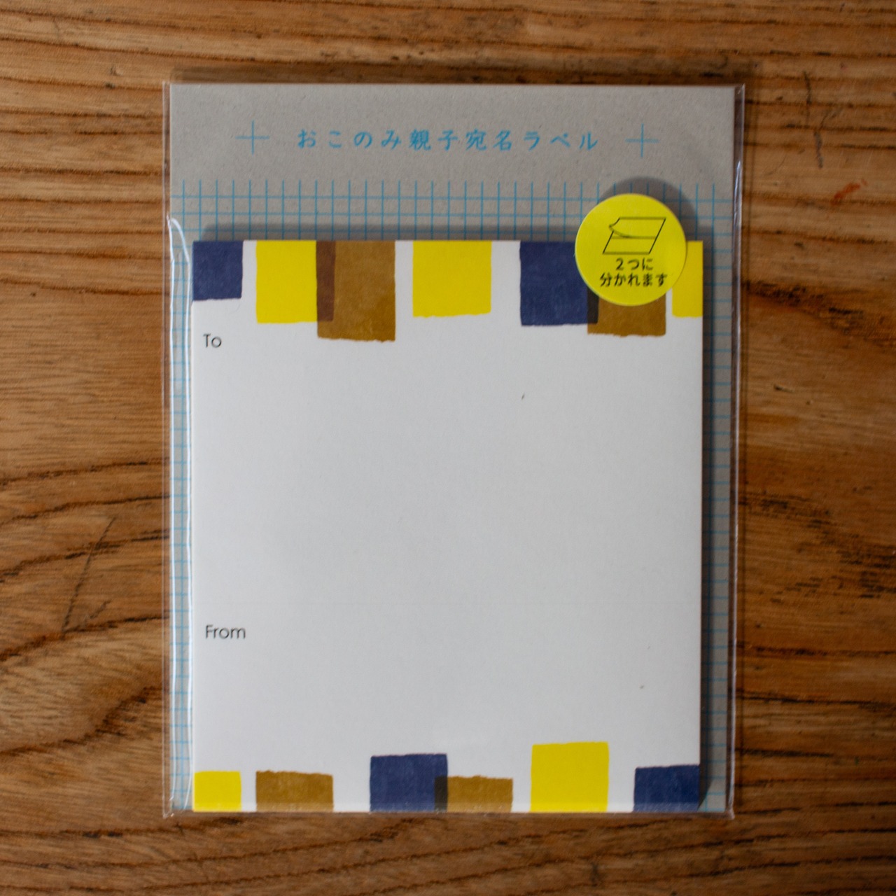 「おこのみおやこ宛名ラベル」は、デザインのバリエーションが豊富な宛名ラベルのシリーズです。「宛名」と「差出人」の2枚がひとつのシートに連なっているので、同じデザインモチーフで裏表にお楽しみいただけます。「テープ」はちぎったテープを貼ったようなイメージでつくりました。