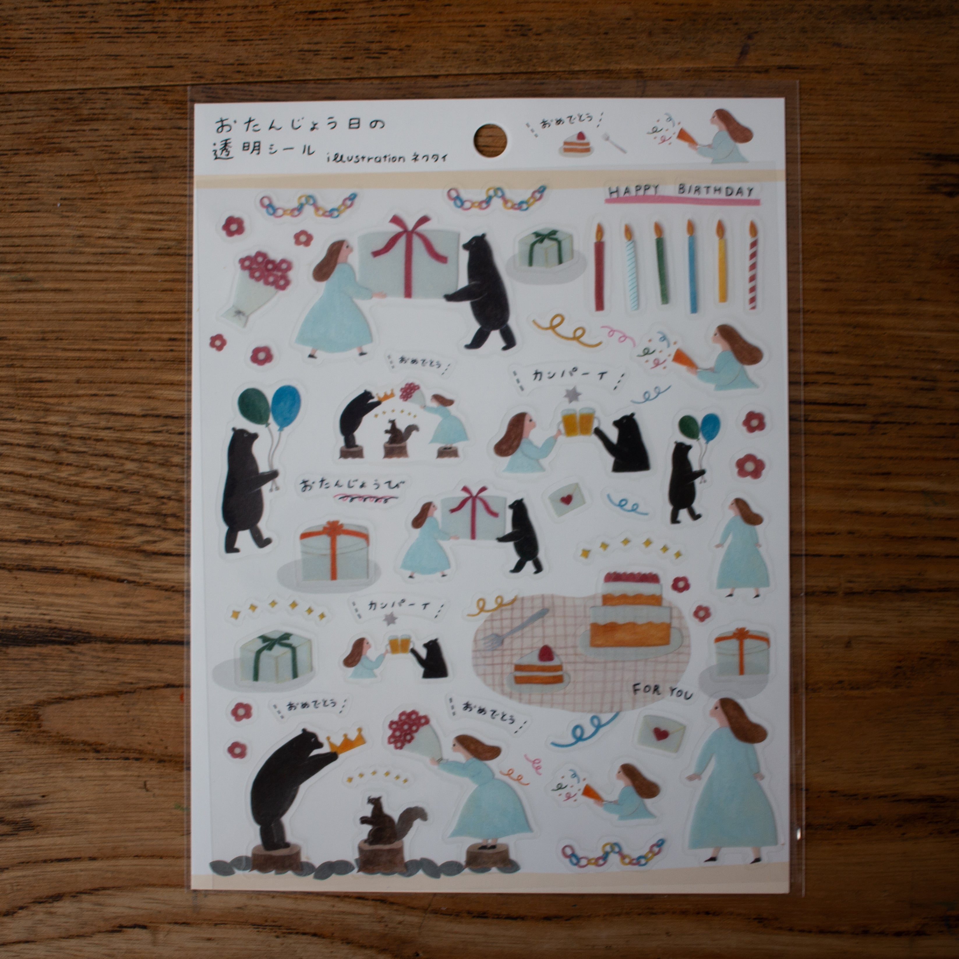 誰かのお誕生日を祝うくまさんと女の子が描かれた、かわいくてユーモアたっぷりのシール。