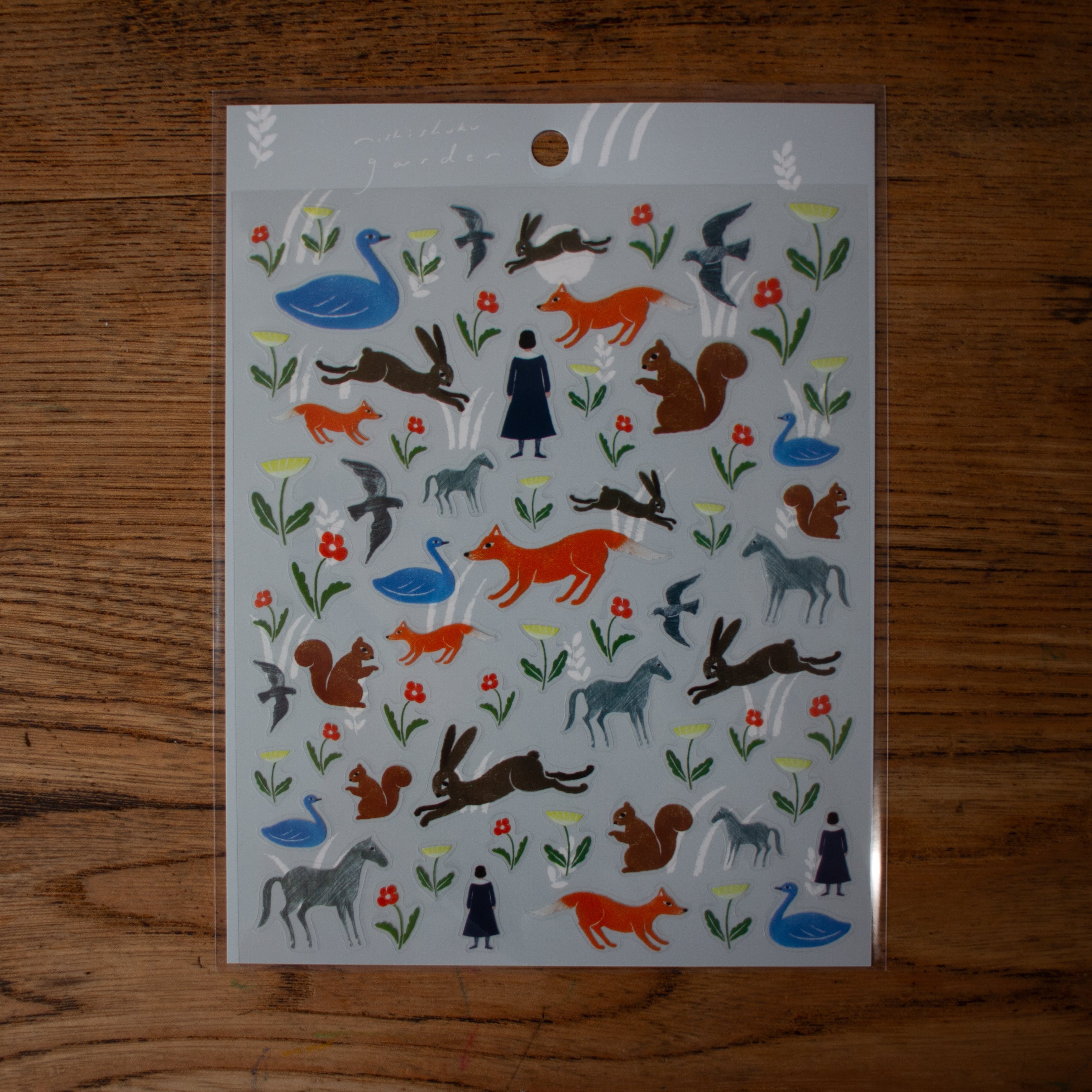 いろいろなサイズのお花と動物たちのシールが、1枚にたっぷり集まったデザインです。